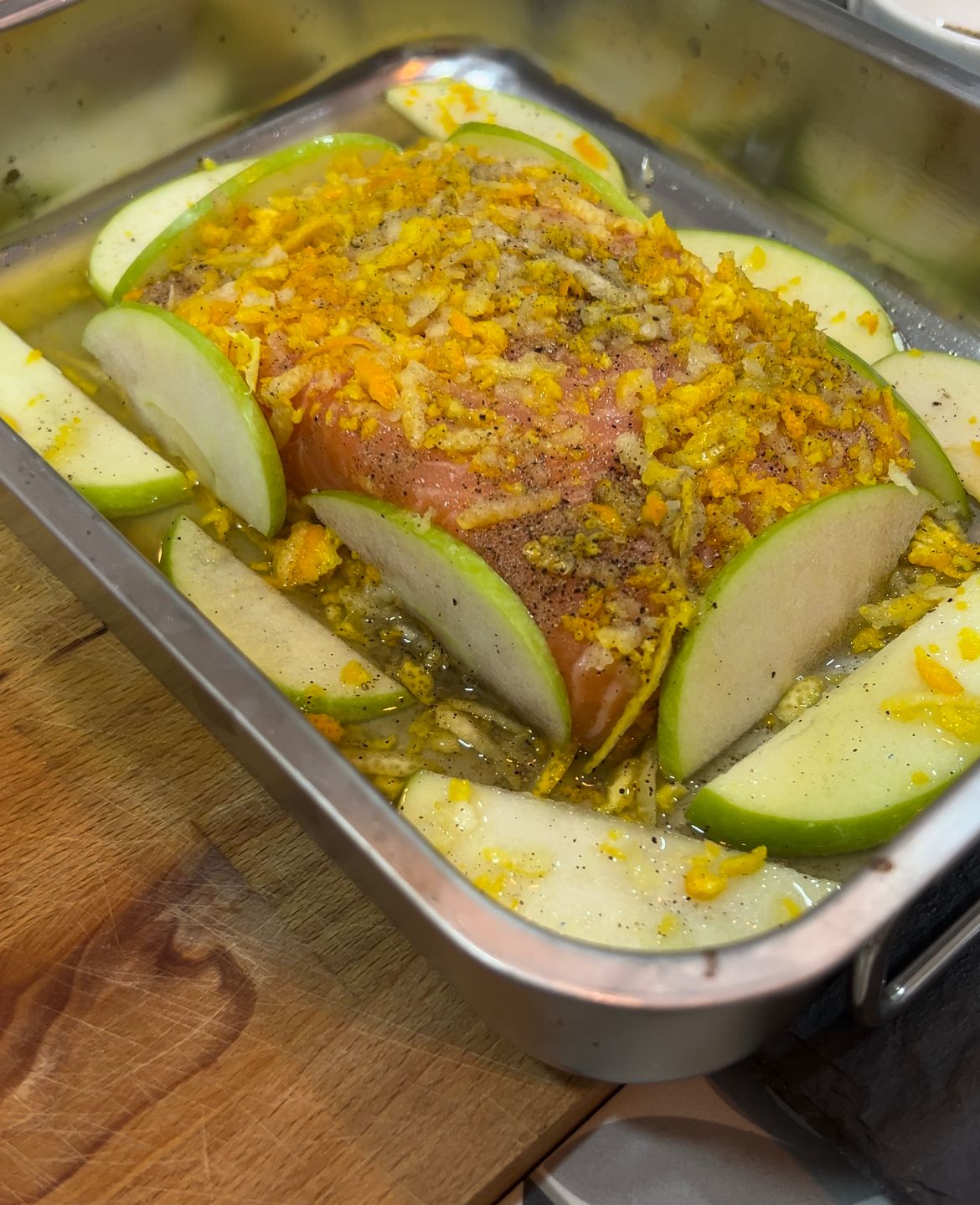 Col·loquem el salmó a la safata i el condimentem amb les espècies i els cítrics.